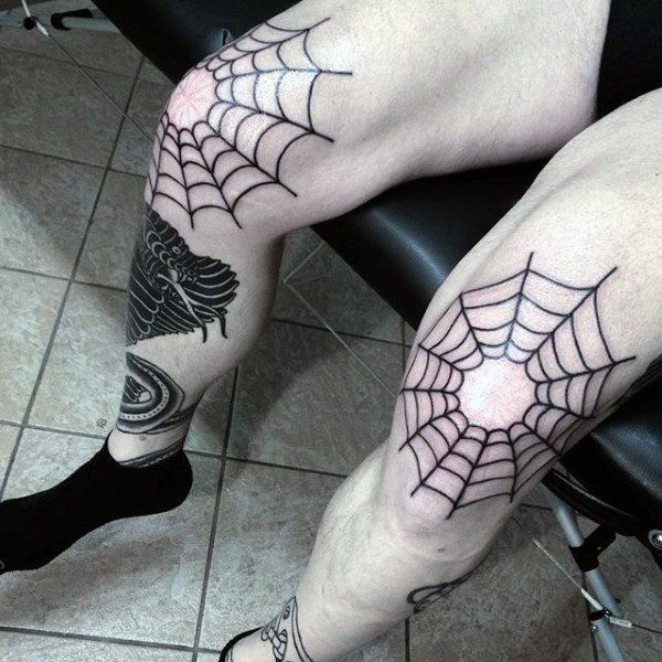 Татуировку паутина на плече (так же, как и тату с паутиной на груди) чаще всего можно увидеть у мужчин (особенно байкеров). Такой нательный рисунок становится ярким акцентом мужского имиджа. Не менее интересный вариант – тату с паутиной на колене.