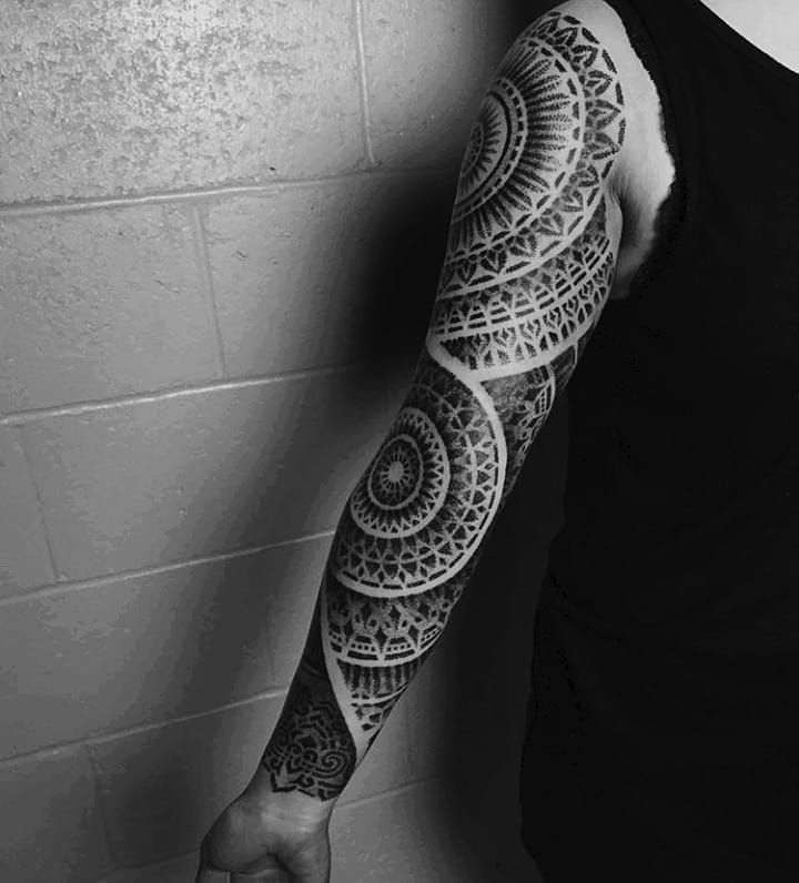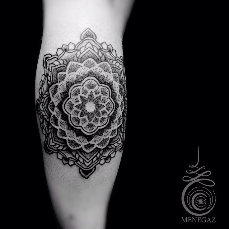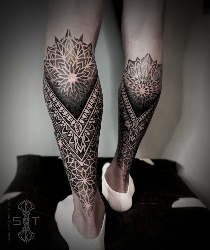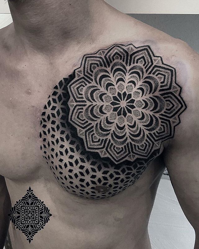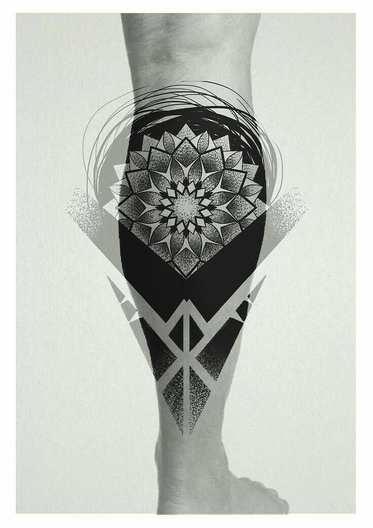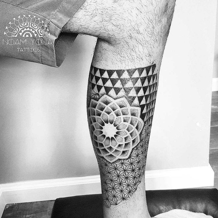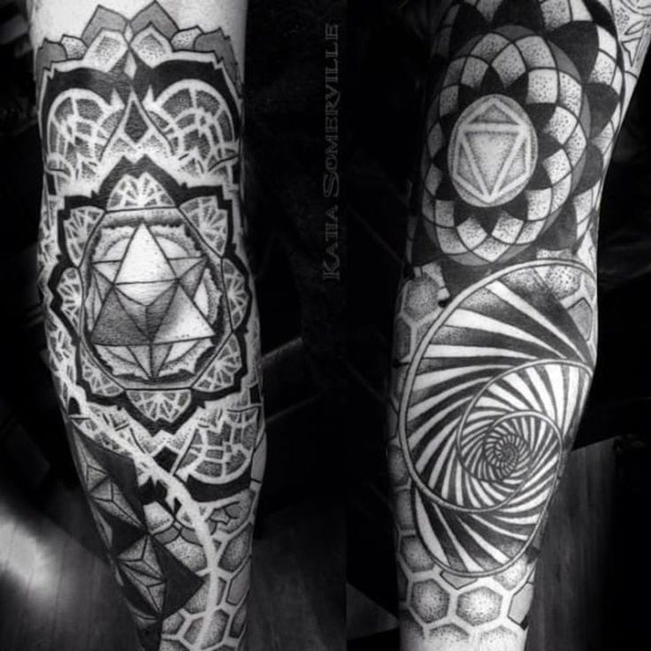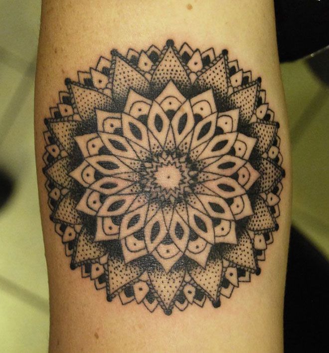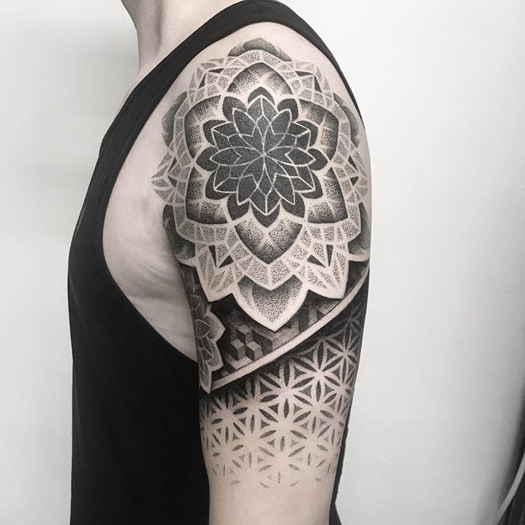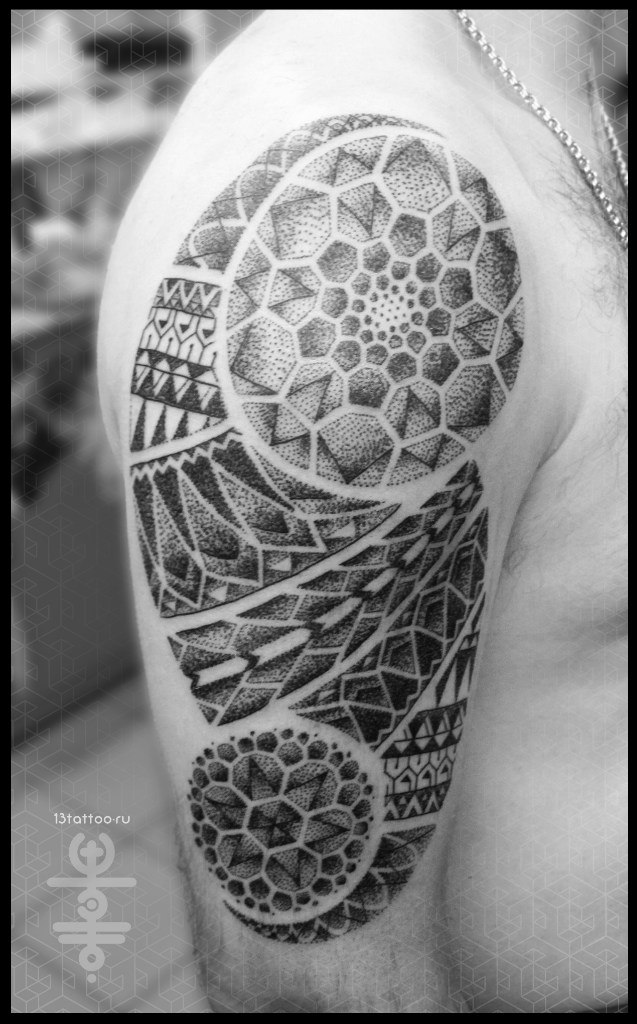 Вот еще один отличный пример первоклассной татуировки с некоторыми популярными элементами дизайна. Наиболее примечательной здесь является точечная работа. Последовательность в применении точек очевидна, в то время как изменение плотности увеличивает контраст с отрицательным пространством и полностью черными частями рисунка.