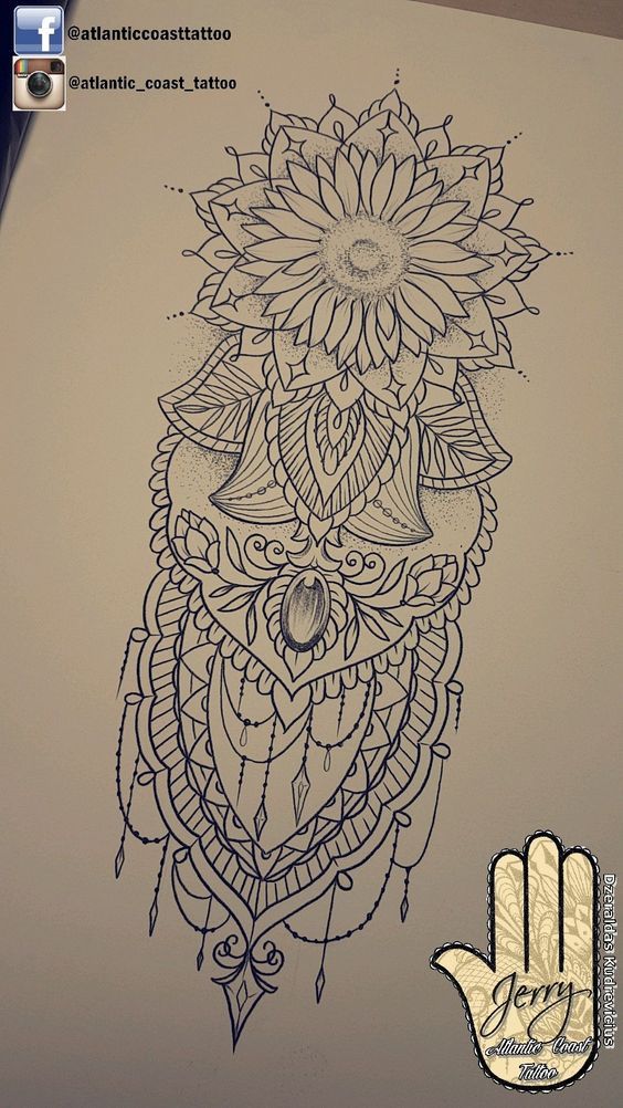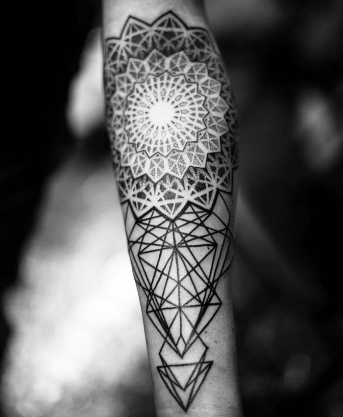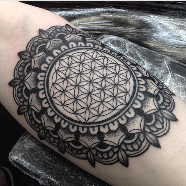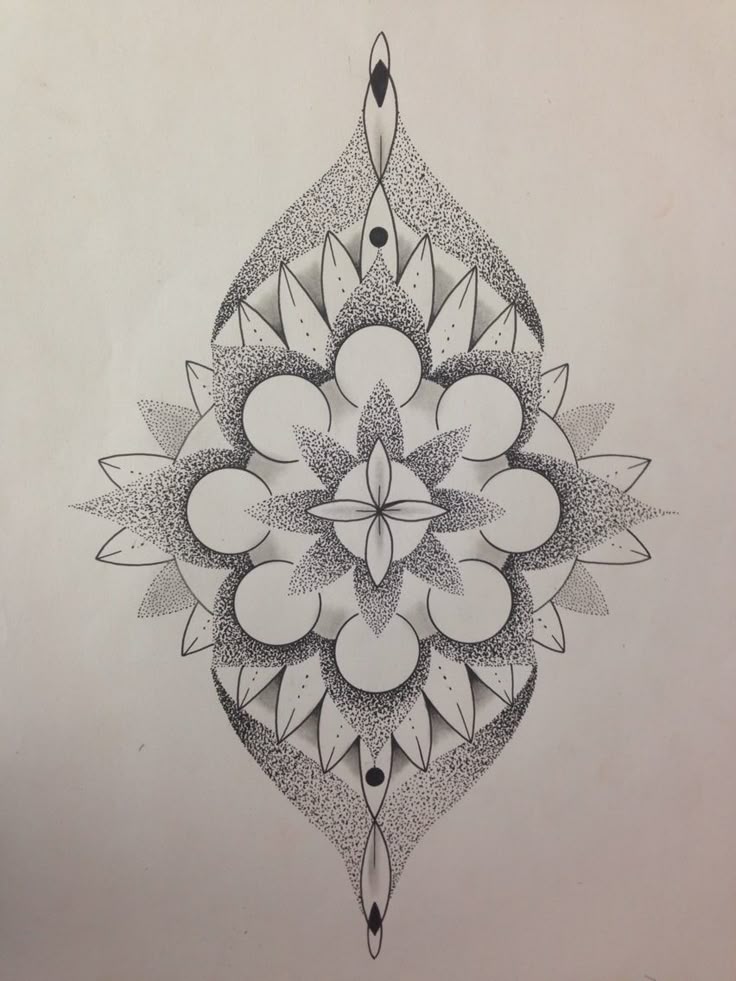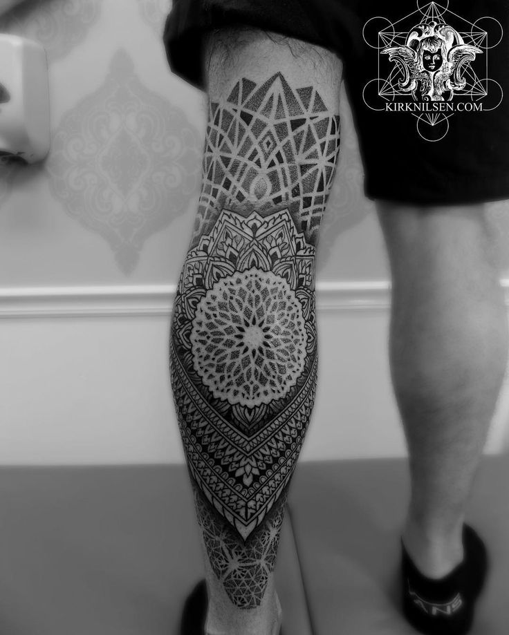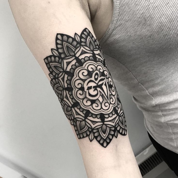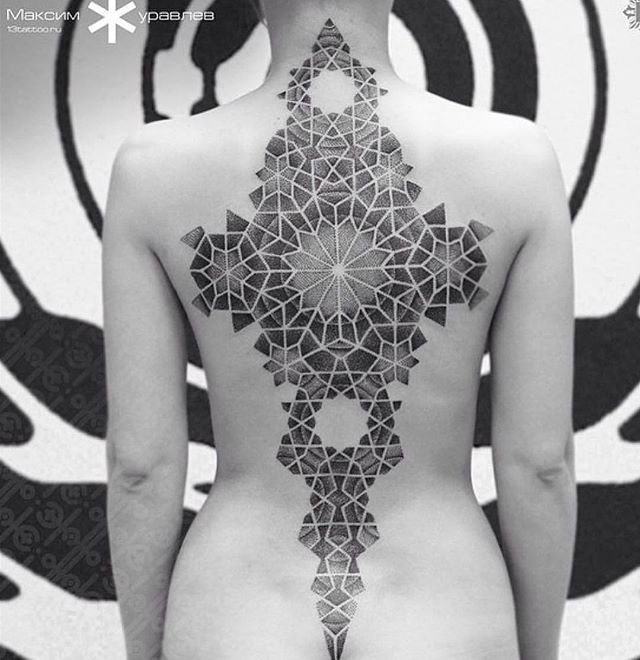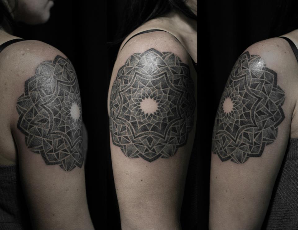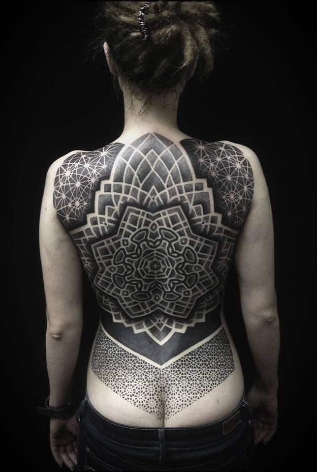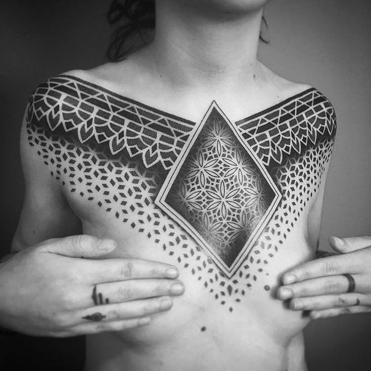 Вот еще один отличный пример первоклассной татуировки с некоторыми популярными элементами дизайна. Наиболее примечательной здесь является точечная работа. Последовательность в применении точек очевидна, в то время как изменение плотности увеличивает контраст с отрицательным пространством и полностью черными частями рисунка.