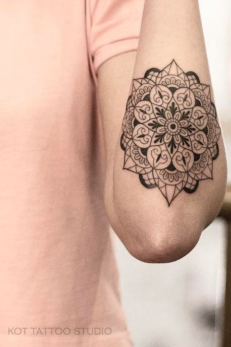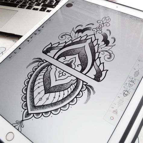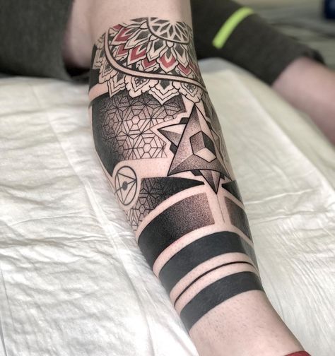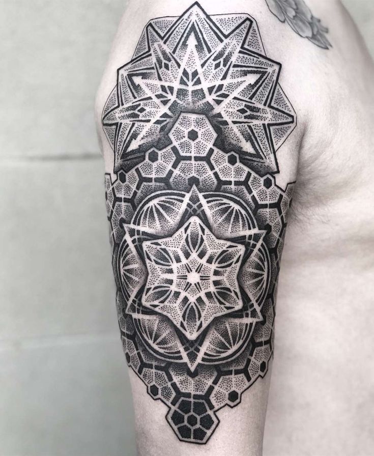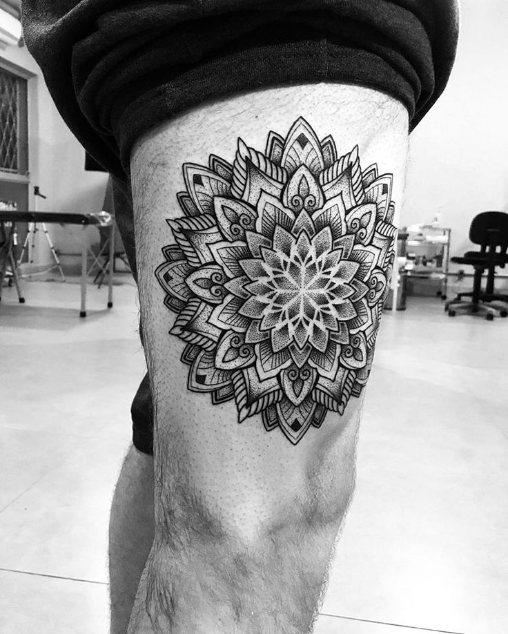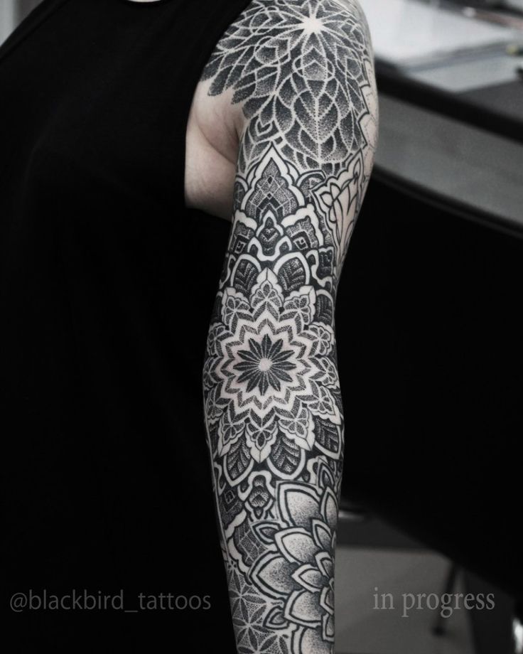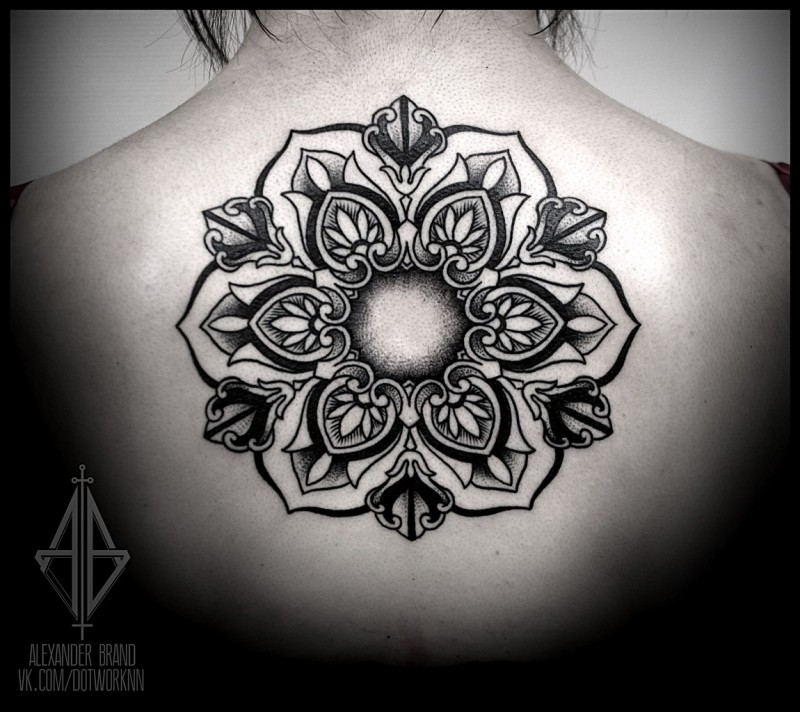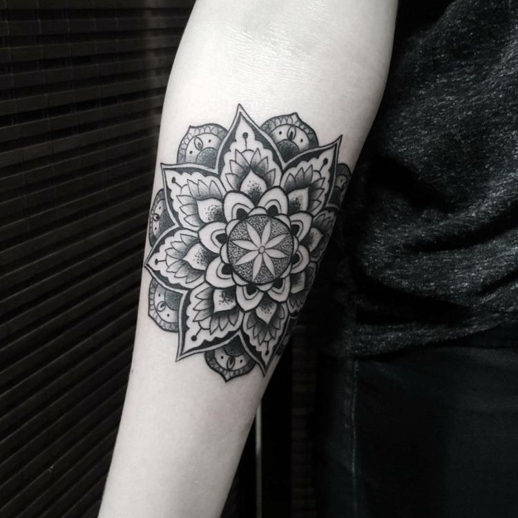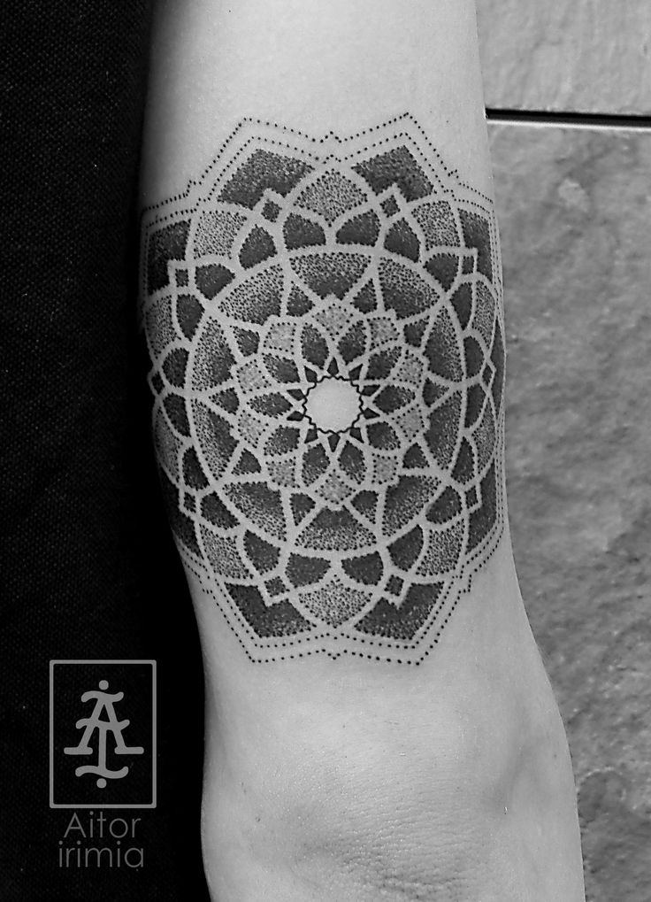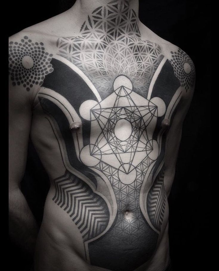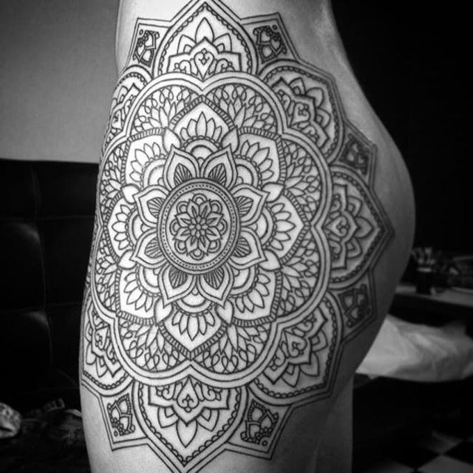 Вот еще один отличный пример первоклассной татуировки с некоторыми популярными элементами дизайна. Наиболее примечательной здесь является точечная работа. Последовательность в применении точек очевидна, в то время как изменение плотности увеличивает контраст с отрицательным пространством и полностью черными частями рисунка.
