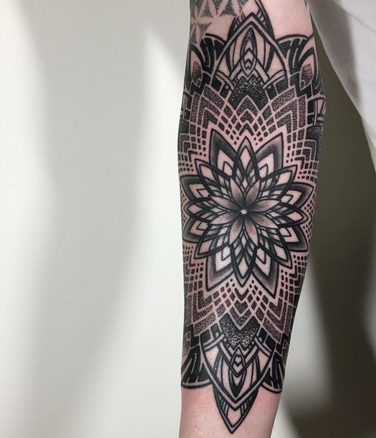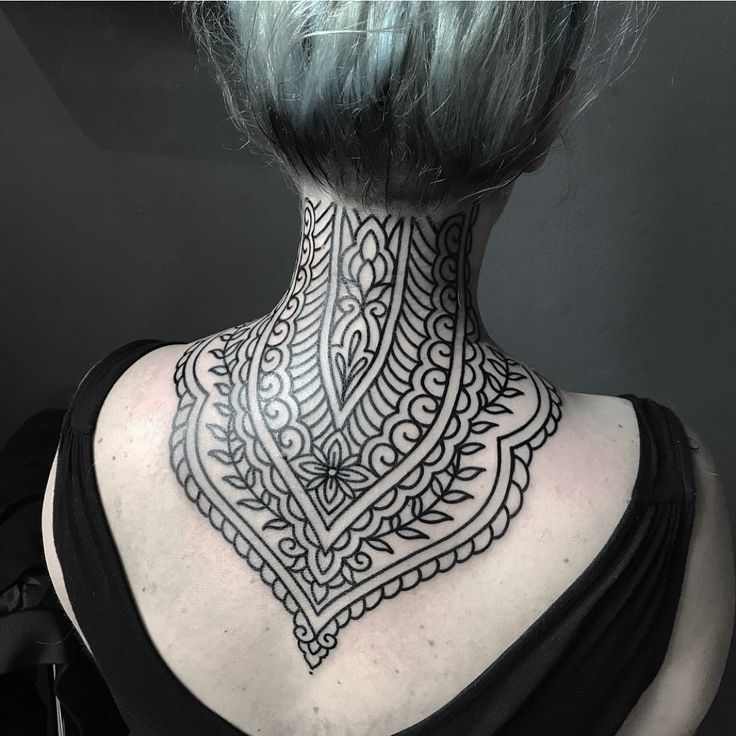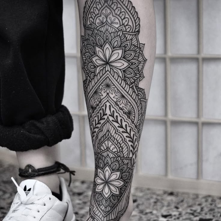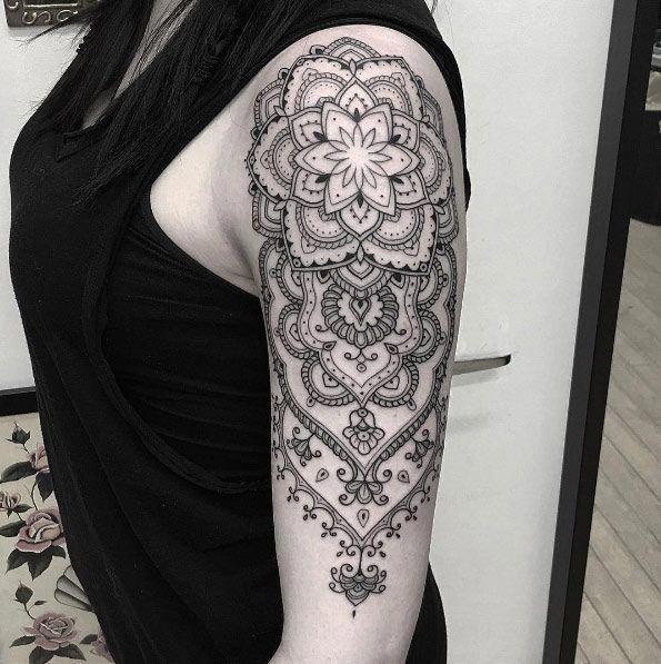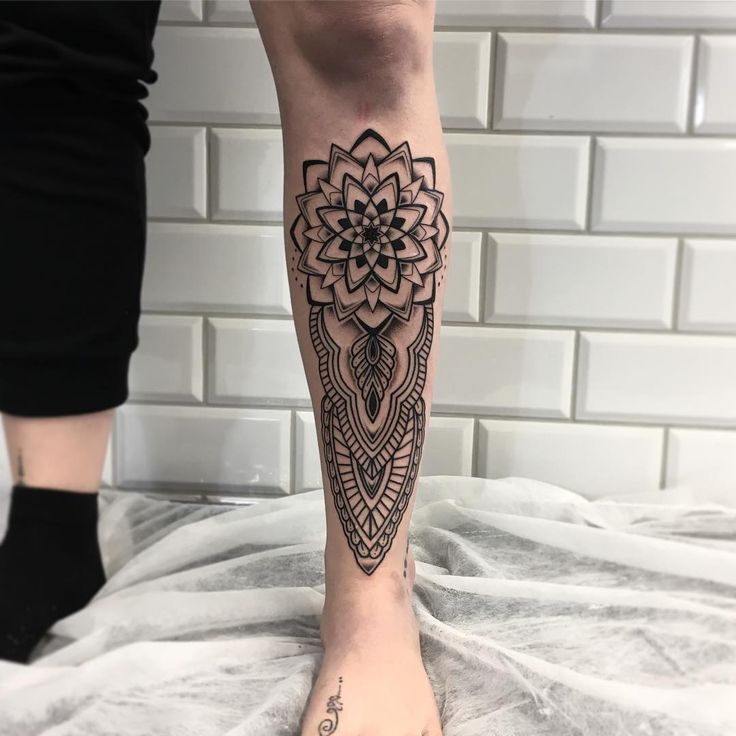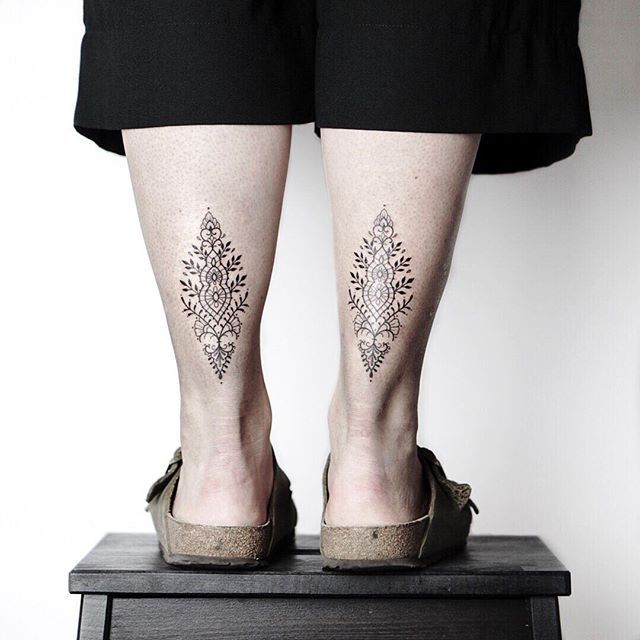 Кружевные татуировки становятся все более и более популярными, и этот дизайн является примером одного из орнаментов, определяющих стиль. Различные перекрывающиеся узоры создают многослойный эффект, который успешно использует негативное пространство для увеличения контраста и создания интересной татуировки без необходимости использования цвета. Работа линии чистая и точная, художница использует различные техники растушевки, чтобы передать уникальную текстуру кружева. Штриховка и пунктир хорошо нанесены и последовательны, а интересное размещение использует естественные линии стопы.