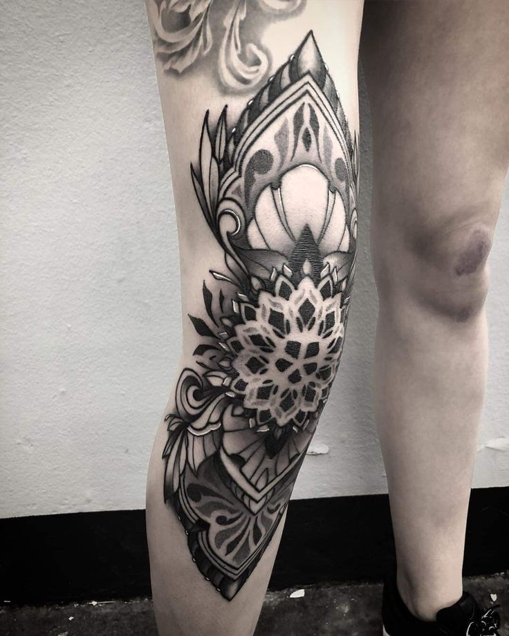 Эта татуировка демонстрирует, как талантливый художник может сочетать разные стили и при этом создавать целостный дизайн. Здесь контраст между тонкими градациями цвета, используемыми для создания лотоса, и точной тонкой линией кружева помогает создать интересный эффект и помогает этой динамичной татуировке выделиться.