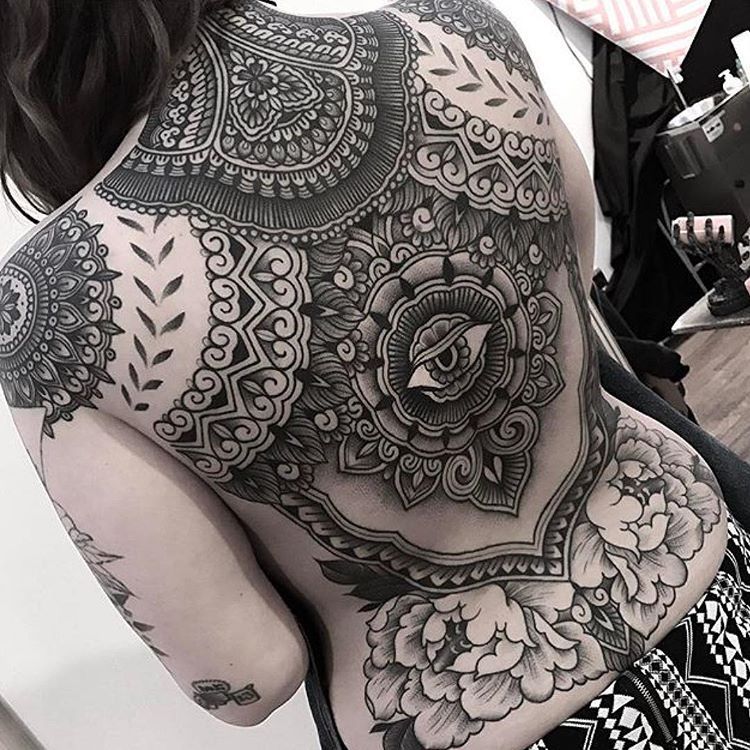 Эта потрясающая деталь на всю спину — невероятный пример того, как кружево можно использовать в больших татуировках. В центре этого рисунка находится изумруд в форме сердца, известный не только искусным использованием цвета и бликов для передачи различных граней драгоценного камня, но и тем, что это единственный цвет в этом черно-сером изделии. Последовательность и внимание к деталям в нитях жемчуга, образующих этот корсетный дизайн, впечатляют, особенно это заметно в балансе рядов в нижней части татуировки. Наконец, к этому произведению добавлены более поздние чернила в виде филигранной работы и завитков, которые напоминают орнаменты, часто вырезанные на мраморных зданиях и основаниях статуй.