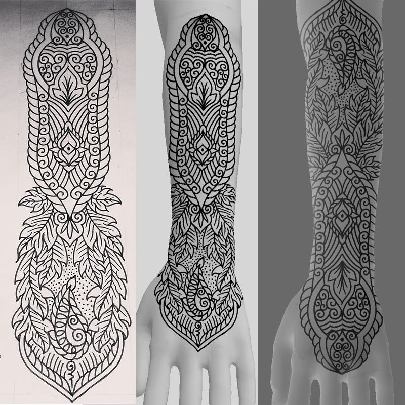 В этом изделии успешно используются цвет и тонкие линии для создания великолепной татуировки с использованием изящных кружевных узоров. Расположение на запястье красивое, и то, как драгоценные камни ложатся на руку, даст зрителям лишь намек на украшение, когда владелец носит одежду с длинными рукавами.