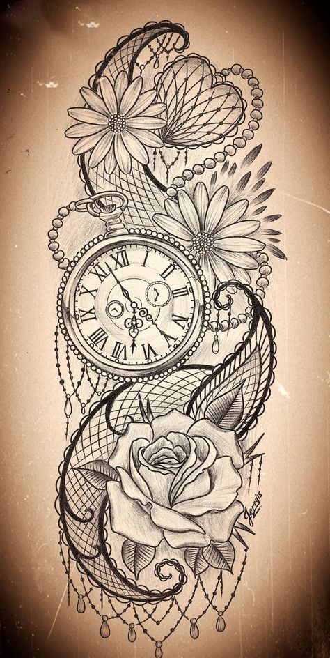Часы в окружении цветочных композиций уместны для женских и мужских татуировок.![]()