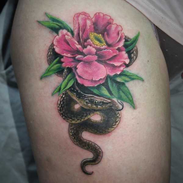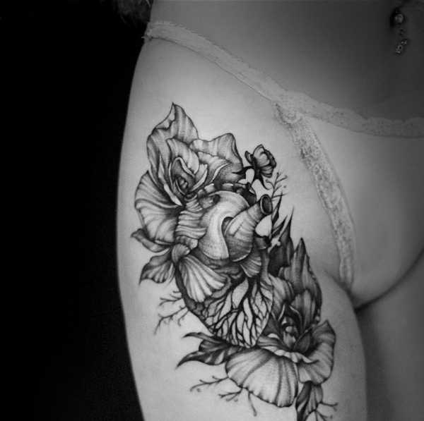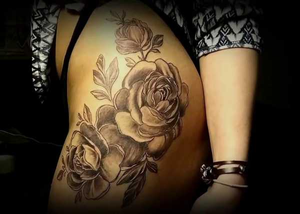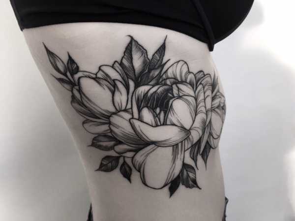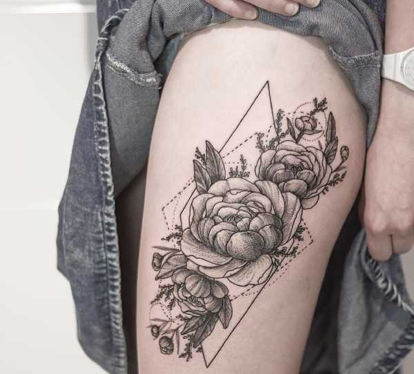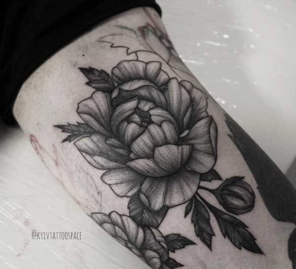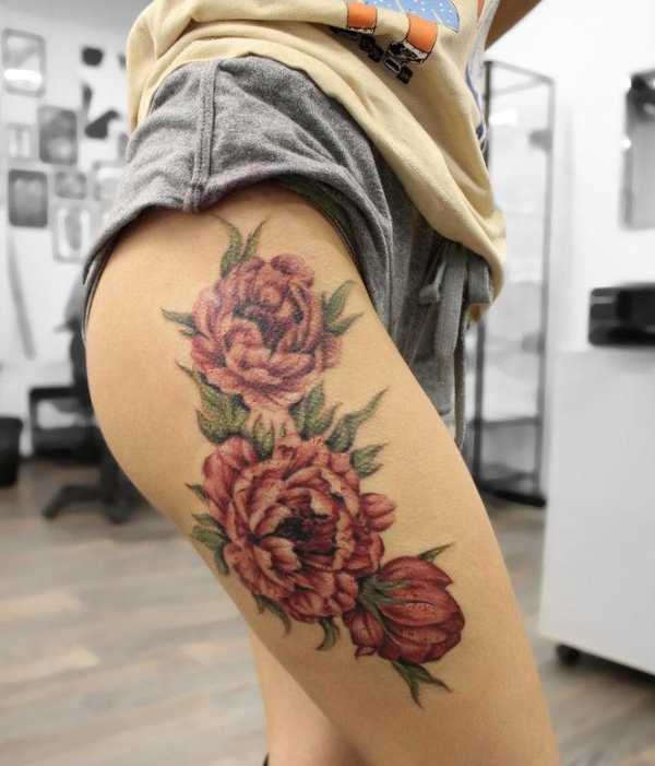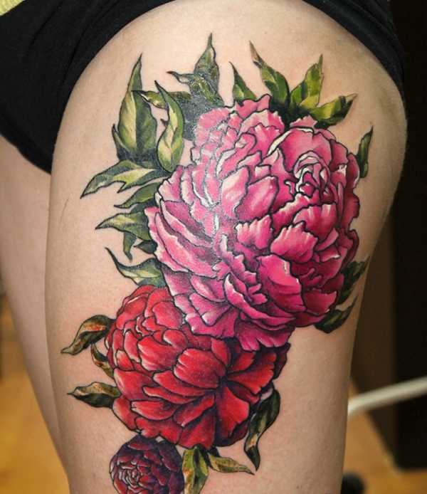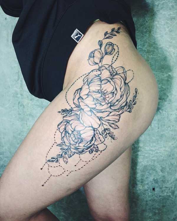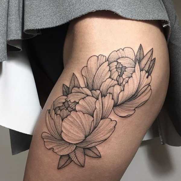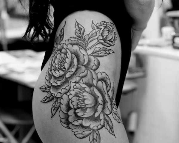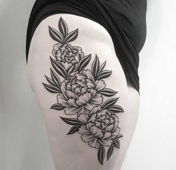 - Бедра – оптимальный вариант для тату пион, так как размер участка тела позволяет сделать крупный рисунок, да и смотреться он будет крайне уместно и привлекательно. В большинстве случаев здесь создают целые картины, включающие букеты пион и дополнительные элементы.