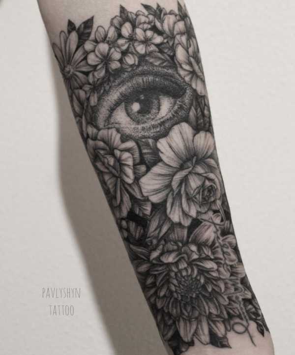 - На «рукавах» принято использовать большие картины, имеющие определенную смысловую нагрузку. Зачастую здесь используют букеты цветов или пионы, объединенные с геометрическими фигурами, абстракциями. Также пользуются спросом пионы с птицами, часами или животными.