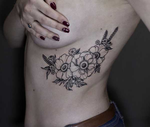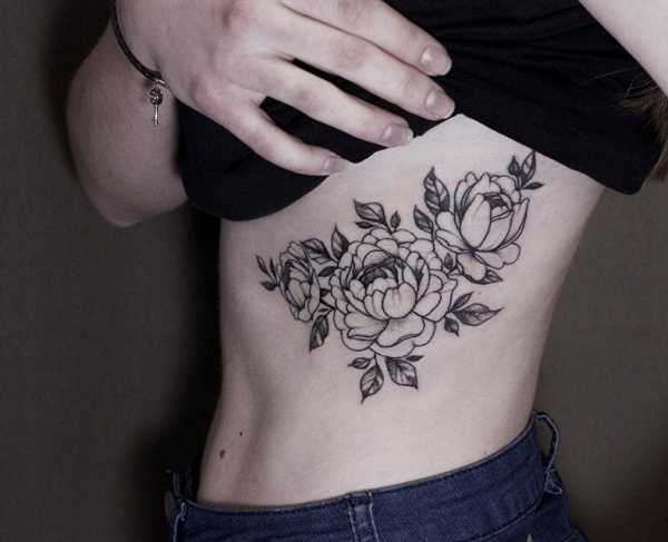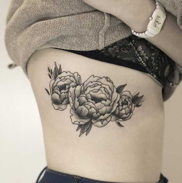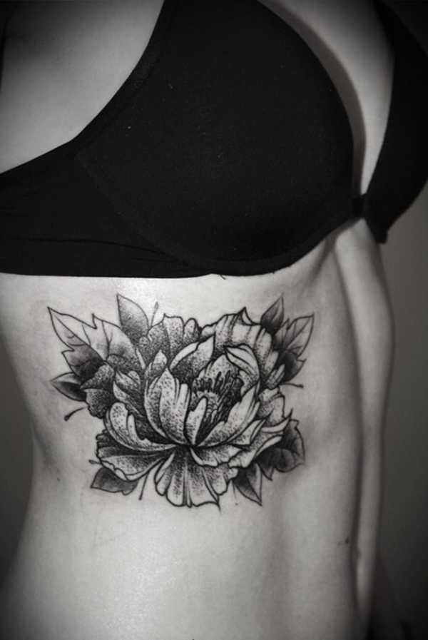 - Ребра, грудь или место под ней – зачастую здесь используют тату пион с дополнением в виде надписей. Сам пион особого значения не несет, его цветку придает расположенная вблизи надпись.