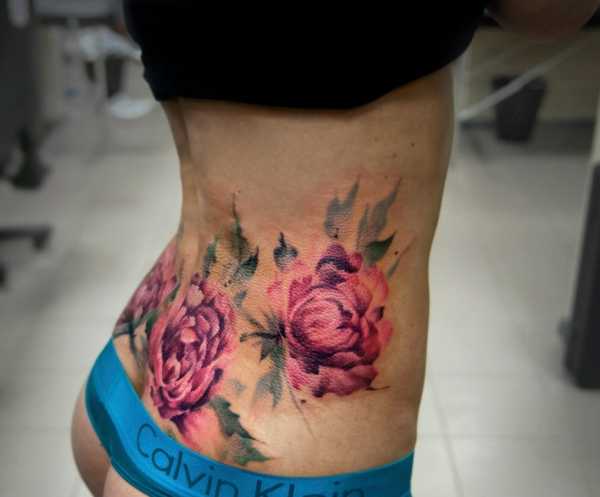 - Живот – благодаря большому горизонтальному участку тела можно создавать целые картины, дополненные разными элементами и предметами. Подобное тату всегда будет выглядеть красиво, но не рекомендуется девушкам склонным к полноте или тем, что еще не рожали.