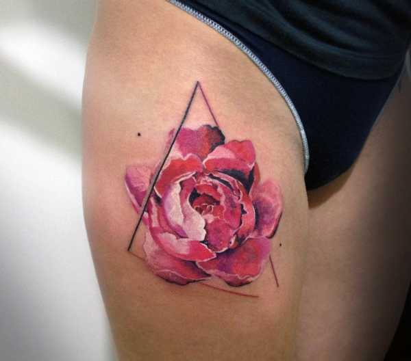 - Пиона в треугольнике – значение татуировки зависит от значения дополнительного символа. Как известно, треугольник – это символ духовной силы, мудрости и единства мужского и женского начала. Именно поэтому и общая картина будет являться символом мудрости, целомудрия и нравственности.