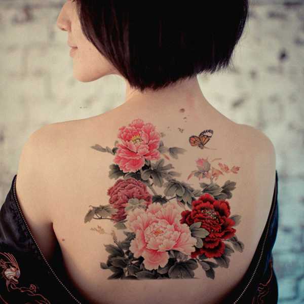 Наряду с другими цветами, пионы являются излюбленной темой в китайской живописи. Эскизы татуировки с изображением пиона бывают как черно-белые, так и цветные. В Японии и Китае пионы являются почитаемыми цветками и стоят наравне с лотосами, хризантемами и сакурой. В японских татуировках цветы часто соединяются с драконами, тиграми и демонами. Такое сочетание подчеркивает баланс между силой и красотой. Пионы традиционно изображают с японскими львами, где животное означает защиту, а цветок – покой. В китайской культуре пион долгое время имел национальное значение и назывался «королем цветов». Он олицетворял богатство и честь, а также символизировал любовь и процветание. Его большие распахнутые лепестки и яркий красный или розовый цвет всегда легко узнавались. Изображения пионов использовались в живописи, вышивке, при изготовлении посуды, а позже перекочевали в татуировки.