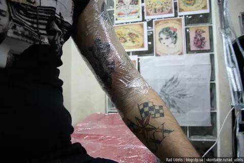 В идеале свежую татуировку промывают, наносят заживляющее средство, поверх накладывается сорбционная повязка, и потом уже фиксируется пленкой.