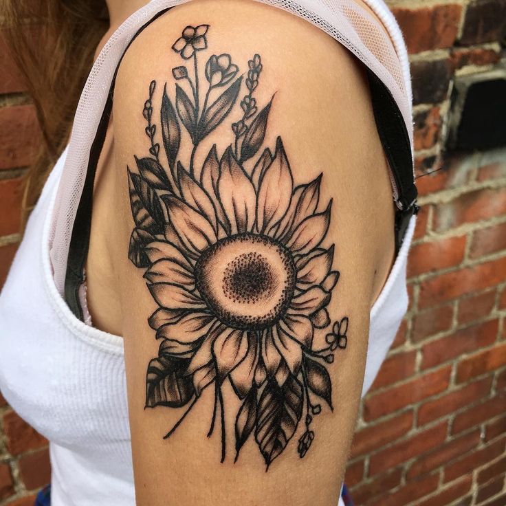 Эта черно-белая татуировка подсолнуха показывает, что рисунок подсолнуха настолько узнаваем и силен, что его можно легко идентифицировать, даже если он выполнен в оттенках серого, а не в фирменных цветах подсолнуха.