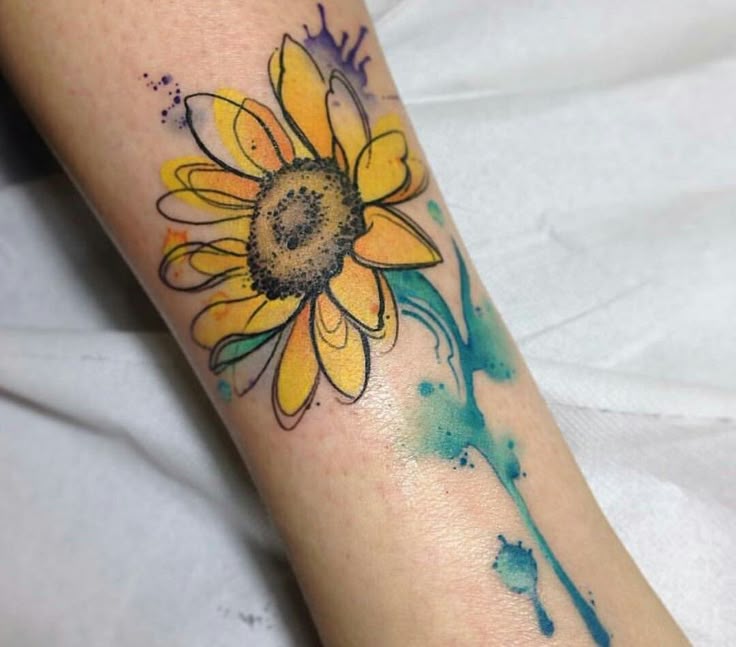 Как подобрать рисунок для татуировки подсолнух? Тату подсолнух чаще всего выполняется в самых разных техниках. Одним из самых популярных является акварель . Такая татуировка будет выглядеть красочно и эффектно.