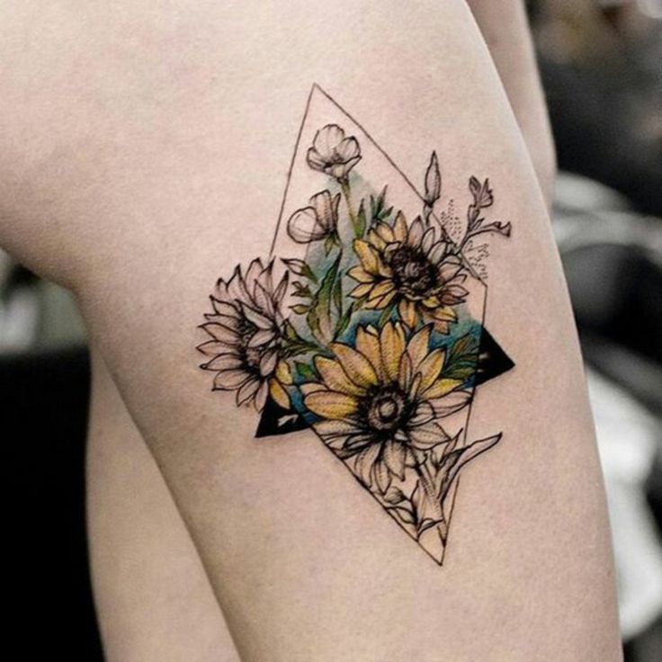 Сочетая реализм с геометрическим стилем татуировки, эта татуировка подсолнуха представляет собой контраст между природой и более рациональной, технологической и научной стороной вещей. Особенно интересно то, как прямые линии проходят над и под подсолнухом, создавая многомерный и визуально интересный вид.