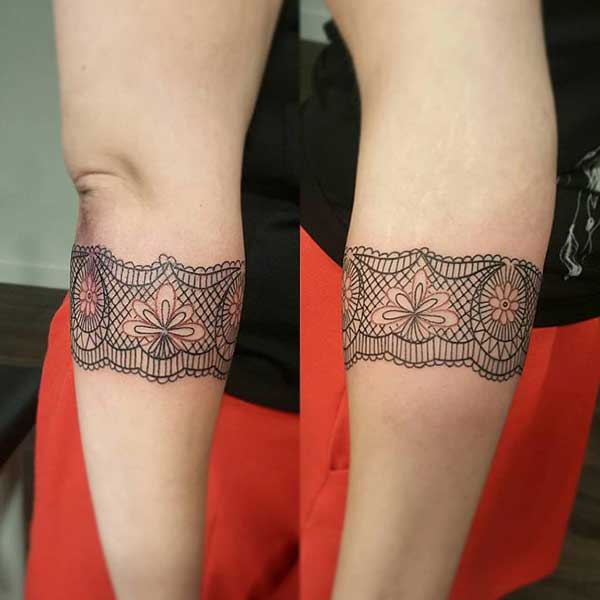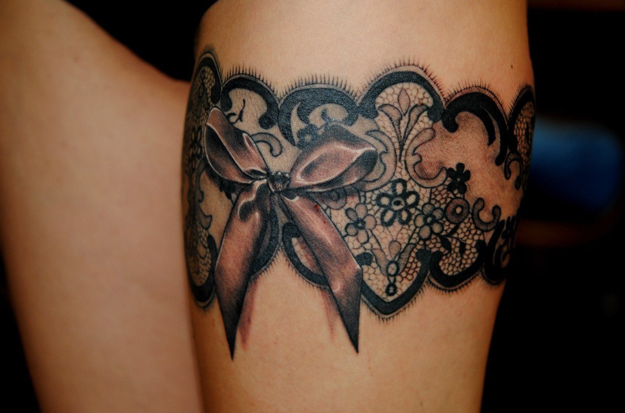 Нередко тату подвязки делают в виде ажурного, легкого кружева, имитируя воздушный красивый материал. Такие детали носили богатые, изысканные дамы, ведь чем тоньше кружево, тем оно дороже. Причем его не плели, а вырезали, что требовало большой точности и мастерства.
