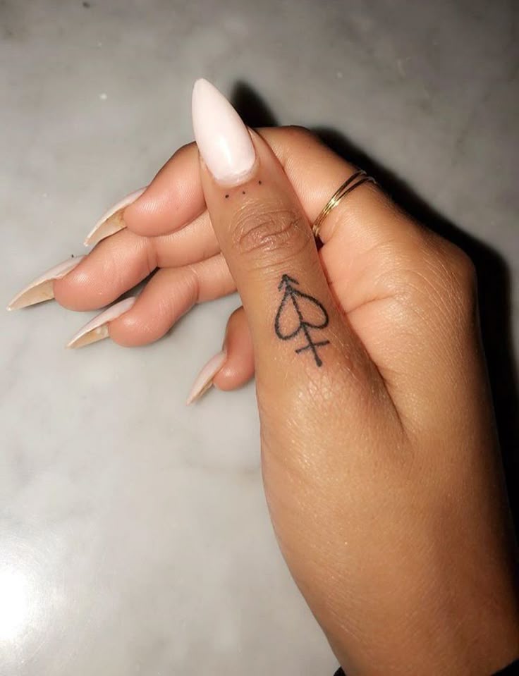 Подумайте об умных комбинациях с татуировками на пальцах, так как это одно из немногих мест на вашем теле, которыми вы можете легко манипулировать и комбинировать. Эта двойная татуировка в виде колчана и стрелы сладкого купидона имеет очень простой стиль и делает ее уникальной, добавляя элемент неожиданности! Обладая таким творческим умом, эта носительница обязательно с легкостью покорит сердце своего избранника.