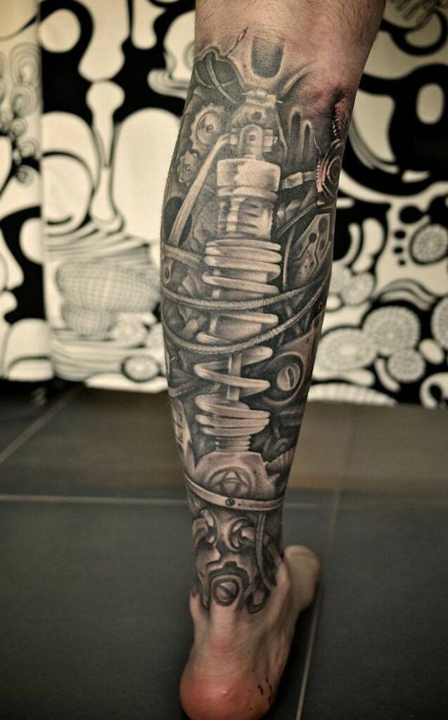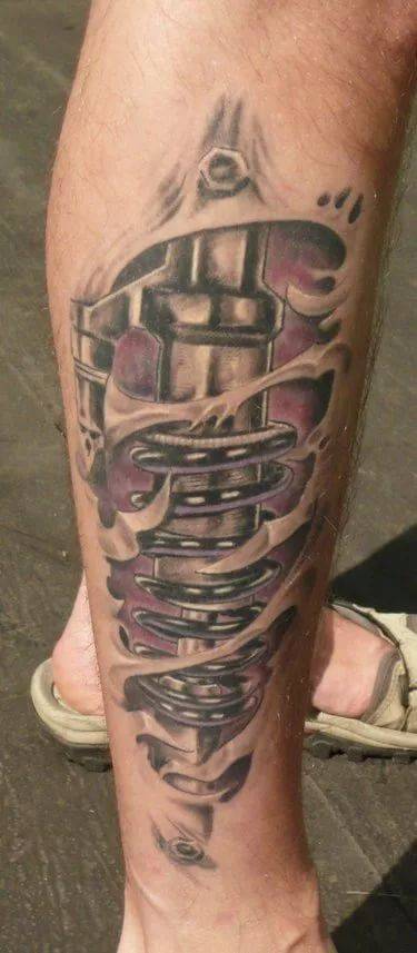 Татуировки в стиле биомеханики создают образ непобедимой сверхсилы, стальное тело и безграничные физические возможности. Правильно выбранный эскиз и место нанесения способны подчеркнуть объем мускулатуры и рельефность. Одним из типичных изображений считают тату на ноге в виде амортизатора.