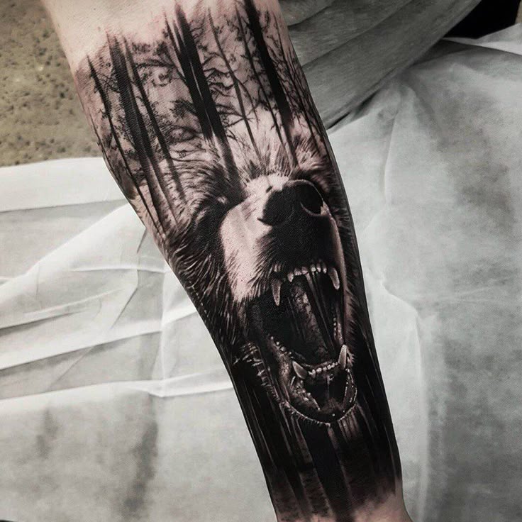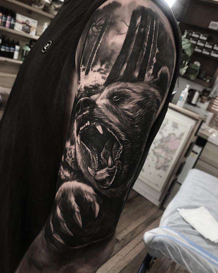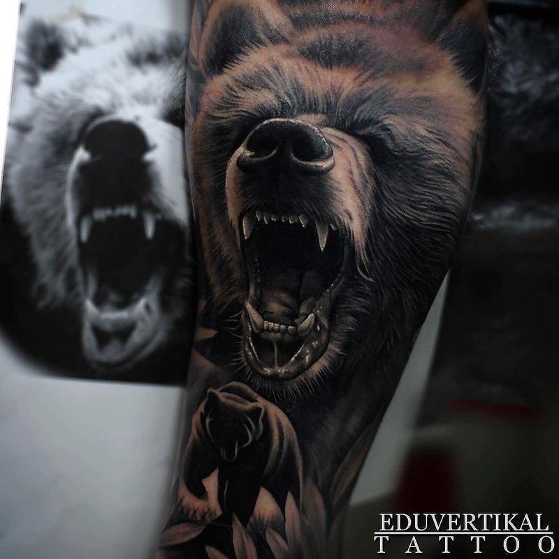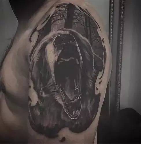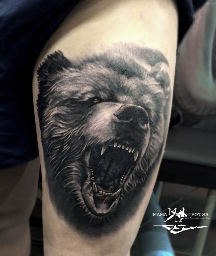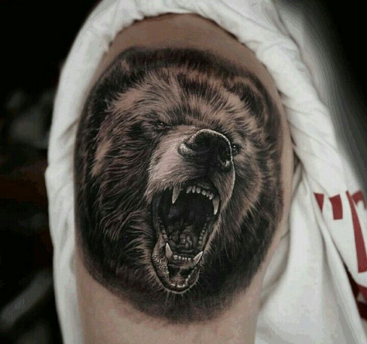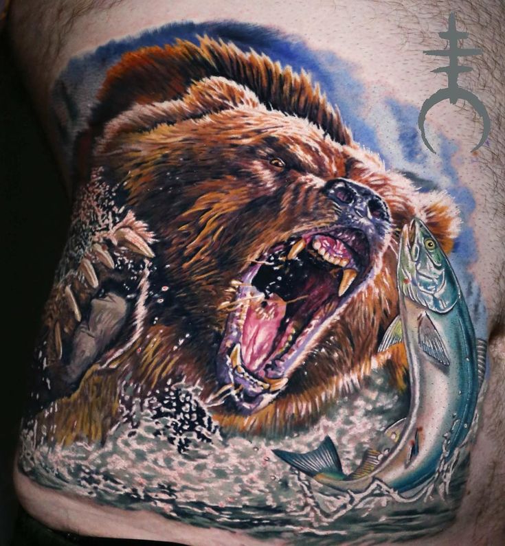 Тату с ревущим медведем символ ярости, силы, мужества, готовности к битве. Сильный и опасный хищник готов к защите, в бою ему нет равных. Чаще всего ревущий медведь становится выбором мужчин.