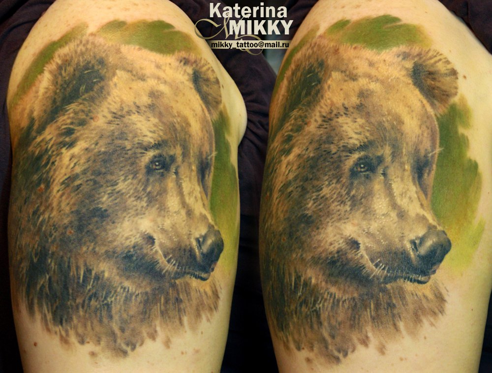 В зависимости от того, какой медведь изображён, в какой композиции, трактуется значение татуировки. Обычно тату медведя изображают довольно реалистичным, поэтому для того, чтоб нанести изображение этого животного нужно обратиться к опытному и умелому тату-мастеру.