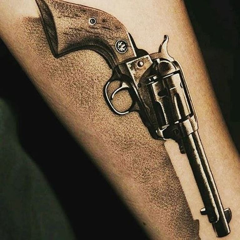 Татуировка встречается двух видов: двойной револьвер и одинарный. Пара скрещенных пистолетов наводит на мысли о Диком Западе, с его ковбоями и захватывающими приключениями. Одинарный пистолет зачастую выбирают люди, которые большую часть жизни провели с оружием. Опытные военные или криминальные авторитеты — тату для них как память о прошедших кровавых временах.