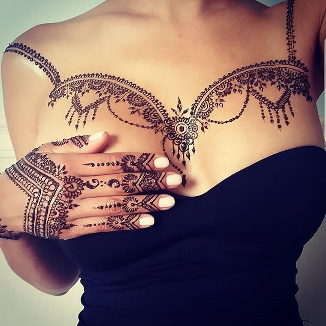 Для тех, кто в чакры не верит, украсить кожу на груди временной татуировкой, значит – подчеркнуть свою сексуальность. Рисунок может быть большим, может быть маленьким — в области груди это неважно, потому что его легко скрыть под одеждой.
