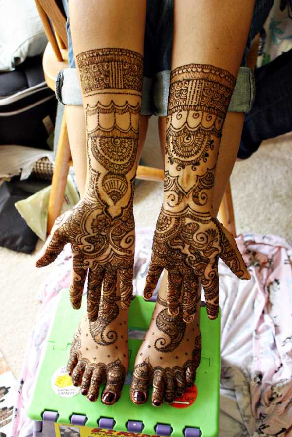 Простые рисунки хной индианки наносят на руки для повседневного украшения, а вот к празднику, например, на свадьбу на руках и ногах рисуют сложные узоры с большим количеством мелких деталей, иногда видела менди похожие на кружевные перчатки, толщина черты с ниточку, да и размер у праздничных мехенди впечатляющий – от кончиков пальцев на ладони и тыльной стороне до плеча, причем на обеих руках.
