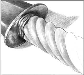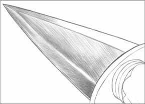 Нанесите штриховку вдоль контуров каждой завитушки на ручке кинжала. Тень для придания формы на ручке затенена с помощью карандаша НВ.