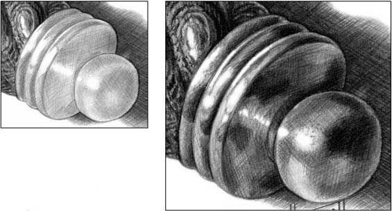 Процесс рисования следующей детали продемонстрирован на рисунках, представленных ниже. Для рисования светлых линий используйте карандаш 2H, полутемных линий – карандаш НВ и для темных линий – карандаш 2B. При рисовании я меняю плотность штриха и давление на карандаш.