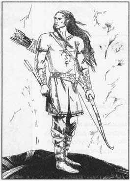 Усиливаем контур и заштриховываем затененные участки. Дорисовываем узоры на рубашке и наручах, тщательно прорисовываем детали, такие как ремни, колчан, лук, стрелы. Работаем над задним планом.