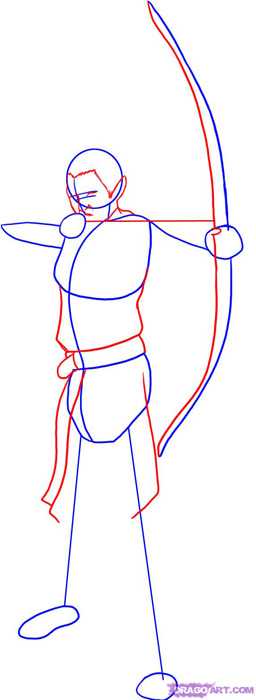 Теперь добавьте формы рук, и прорисуйте глаза и волосы более подробно. Сделайте набросок пальцев лучника.