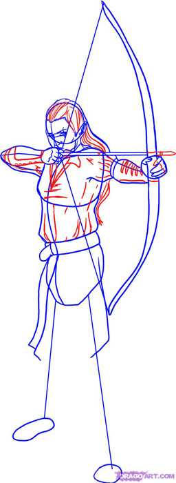 Шаг первый. Набросайте эскиз лучницы в боевой готовности вместе с луком.