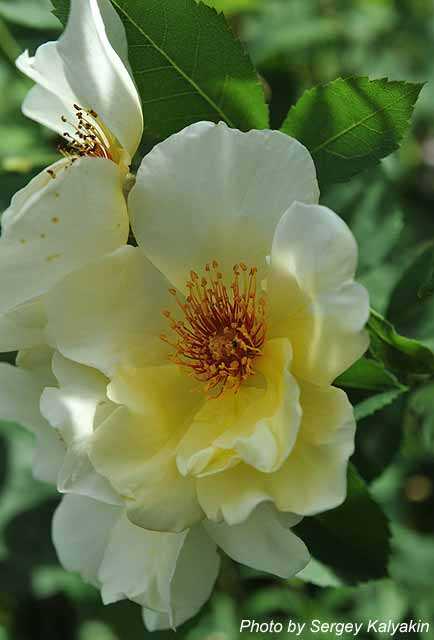 Kordes, Германия, 1931. Frau Karl Druschki x Rosa pimpinellifolia Altaica. Эффектный шраб. Крупные махровые цветки в стадии полного раскрытия показывают яркие желтые тычинки. Куст густой, со светлой сизовато-зеленой листвой. Цветение нерегулярно повторяется в течение лета. Незаслуженно недооцененная роза.