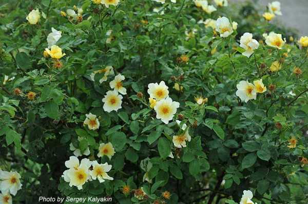 Hillier, Великобритания, 1961, Rosa pimpinellifolia Altaica x Rosa hugonis. Обильно цветущий, высокий, мощный, хорошо облиственный куст. Цветки среднего размера, простые, от кремовых до светло-желтых, с приятным ароматом. Было бы здорово, если бы эта роза чаще встречалась в садах – это прекрасный солитер. Однократно цветущая, может расти на бедных почвах, теневыносливая, подходит для живых изгородей, умеренный аромат, ограниченно доступна в продаже. 300 х 120 см. Зона 6b.