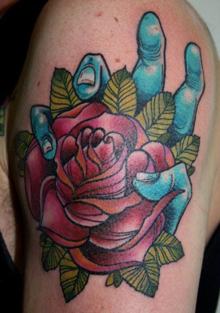 Мы также можем увидеть потрясающую голубую розу, а также несколько удивительных татуировок с черными розами и даже одну с черепом. Он демонстрирует все элементы, которые вы можете добавить к традиционной розе.
