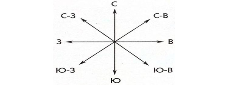 У четырехлучевой «Розы ветров» обозначения лучей определяют направления Север, Юг, Восток и Запад. У восьмилучевой добавляются смежные румбы – Северо-восток, Северо-запад, Юго-восток и Юго-запад соответственно.
