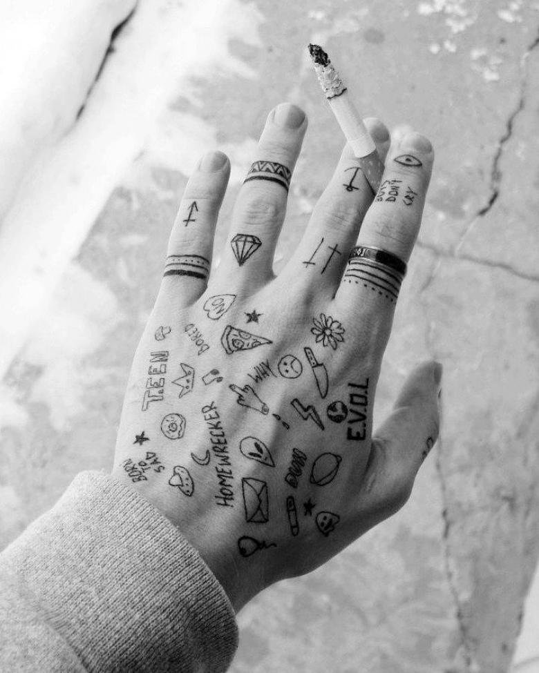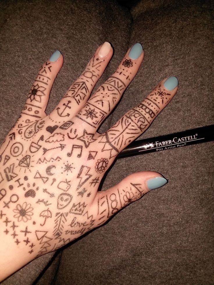 Дизайны с изображением пальцев и/или запястья: Дизайны с изображением пальцев или запястья могут стать отличным способом использования всей руки в качестве холста. Например, небольшой символ или слово на каждом пальце или татуировка на запястье, которая простирается на руку.