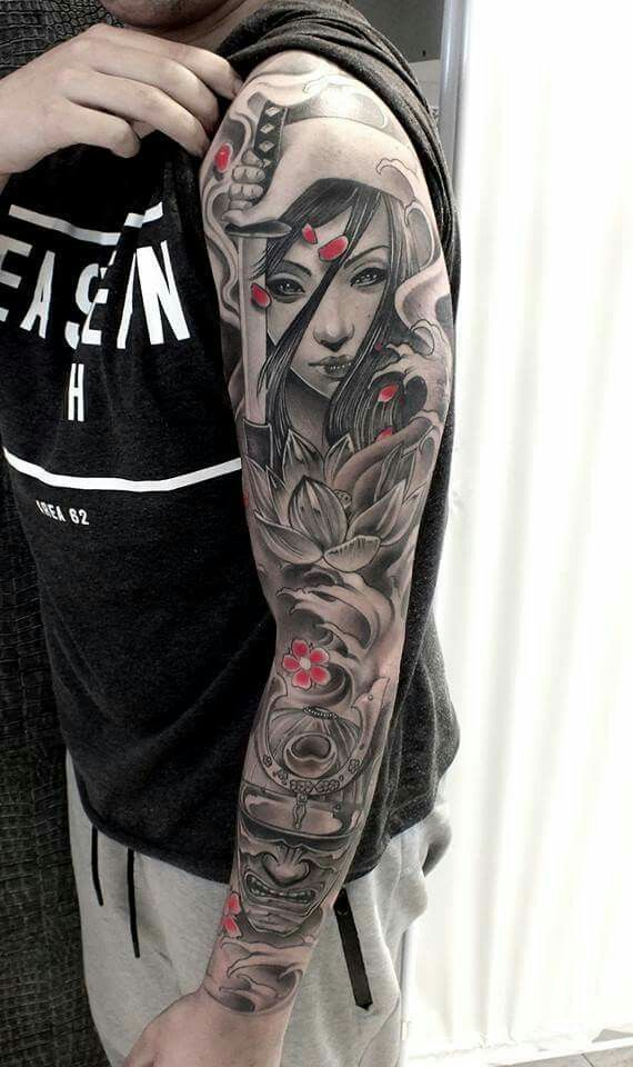 Градиент цвета этой татуировки: черный, розовый и красный. Лицо женщины-самурая в верхней половине и устрашающая маска «они» в нижней половине придают этому дизайну эксцентричную эстетику. Это японская татуировка на рукаве с красными оттенками и различными штриховыми рисунками с глубоким смыслом.