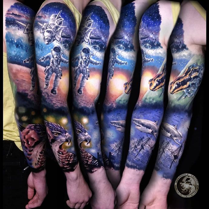 InstagramВ общем, есть два основных способа сделать татуировку на рукаве. Вам нужен цельный дизайн, который хорошо спланирован и составлен, или вы предпочитаете иметь множество несвязанных небольших дизайнов, к которым вы добавляете «заполнение»? Этот человек выбрал последнее, и это выглядит фантастически.