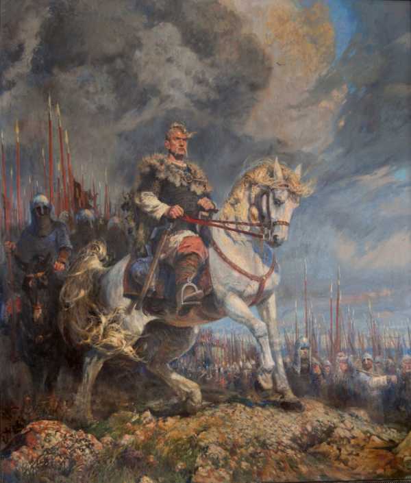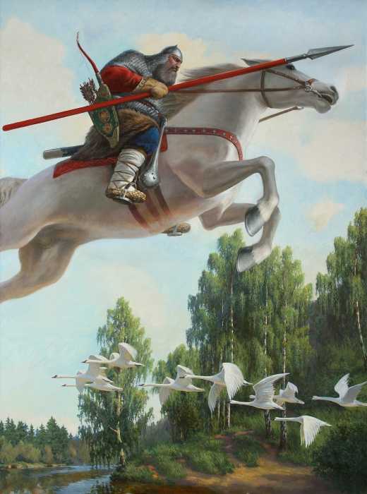 Враг, похоже, действительно ещё далеко: вороной его отметил, но пока и повернуться в его сторону не посчитал нужным, и даже позволяет себе играть, выгибая шею. А копьё Ильи Муромца предостерегающе загораживает дорогу дворянскому коню: «Мы ведь больше не спасаем Святую Софию? Так для чего теперь нам Константинополь? А потом Берлин ещё завоюем? А зачем мне Берлин? Я туда картошку повезу на базар продавать?»