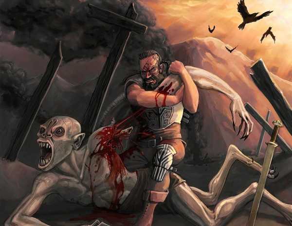 Богатырь оторвал руку у монстра.