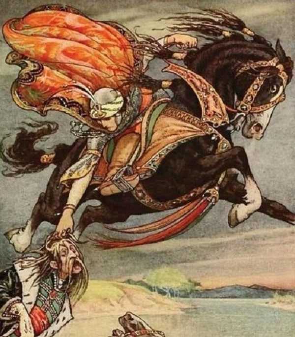 Вообще, весь облик всадника просто кричит о том, что им владеют прямо противоположные устремления, причём одновременно. Его ноги – в стременах и готовы ударить лошадь с размаху пятками. В то же время сидит он в седле очень некрепко, в развалочку, как Илья, чуть ли не курит. Он считает, что враг ещё не подошёл на расстояние выстрела из лука, или он считает, что пора лететь? Если лететь, то в каком направлении?