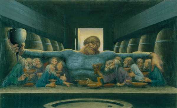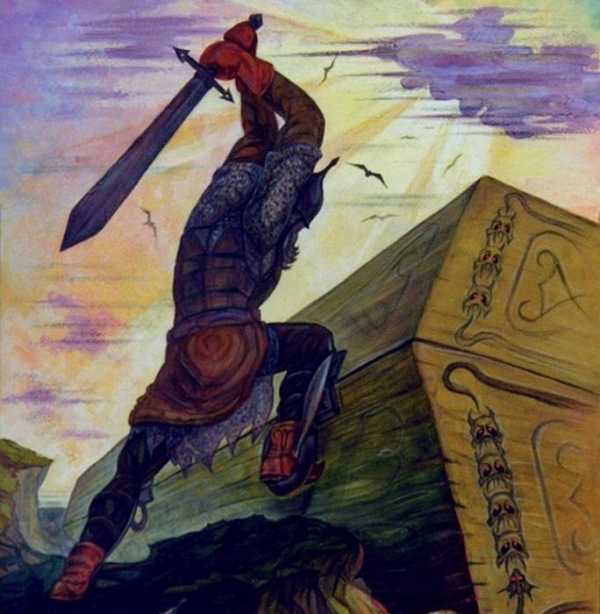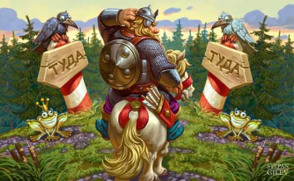 Утомлённый витязь на богатырском белом, но запылённом и уставшем коне оказался на распутье. Прямыми путями никто до него не хаживал. Возвращение назад с прямой дороги закончилось для предыдущих витязей очень плохо. Вон там, чуть впереди, у, как обычно, болота, белеют их косточки. Конь витязя с глубоким интересом разглядывает череп ещё одного погибшего собрата: хорошо утоптанная дорога налево для некоторых закончилась, не успев начаться. Да и пролезешь ли там на богатырском коне через каменный калибратор. А вОроны уже тут как тут. Что имел в виду художник – стервятников, или целых три символа мудрости: мол, трижды подумай, прежде чем свернуть на кривые дорожки?