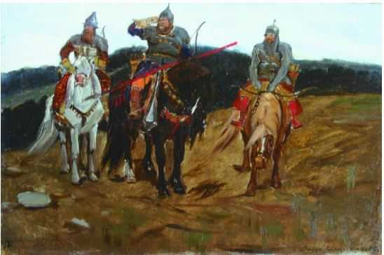 В. М. Васнецов. «Богатыри» (слева направо: Добрыня Никитич, Илья Муромец и Алёша Попович) (1881-1898, Государственная Третьяковская галерея, Москва).