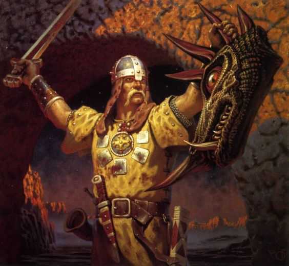 Богатырь держит меч в руках. Богатырь крупным планом.