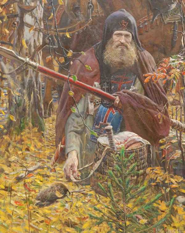 А для кого предназначена стрела в руках Поповича? Если для стрельбы по врагу – то, судя по поведению образа дворянства, стрелять уже даже поздно – враг так близко, что настала пора обнажить мечи. Во-вторых, посмотрим, как у русского духовенства обстоят дела с духовным оружием, так необходимым во время войны и призванным проникать в самое сердце. По мнению автора картины – очень плохо. Лук хлипкий. А стрела – вообще игрушечная. Не это ли тоже смущает Поповича, и не предназначена ли стрела исключительно для демонстрации товарищам? Интересно при этом, что Илье Муромцу Васнецов даёт стрелы что надо.