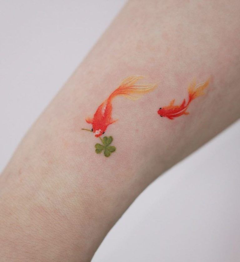 Девушки, грациозные и лаконичные, наносят себе этих рыб, подчеркивая свой внутренний мир, и дополняя его вуалью женственности золотой рыбки.