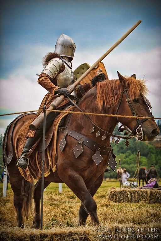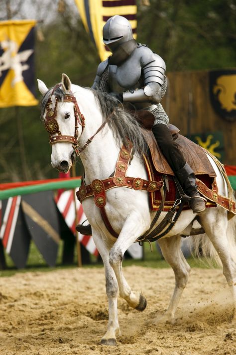 Взрослый мужчина в старинных рыцарских доспехах едет по полю на коне в доспехах в красно-синем одеялеPREMIUM