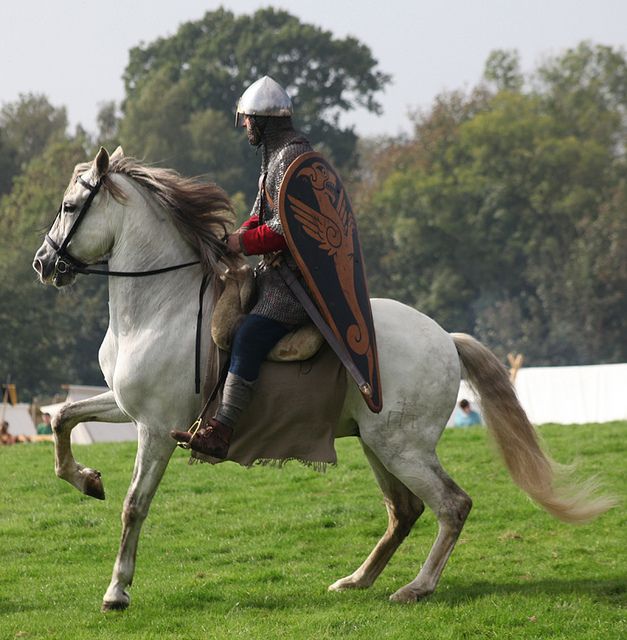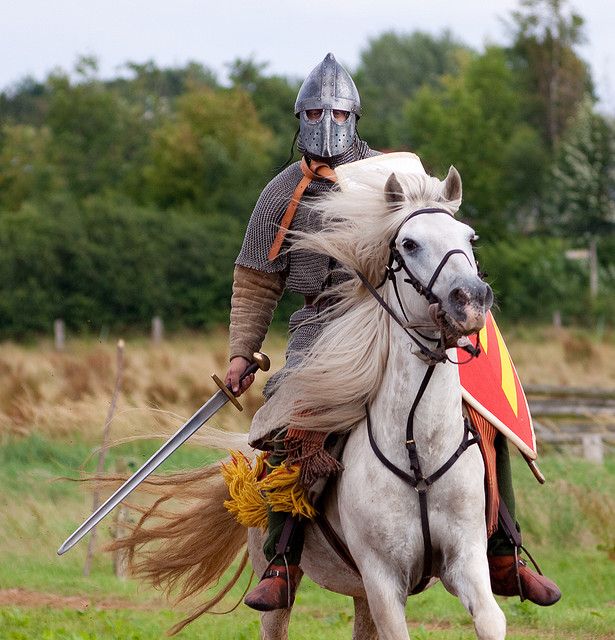 Женщина в кольчуге в образе средневекового воина стоит с мечом в ее руке рядом с лошадью в поле.