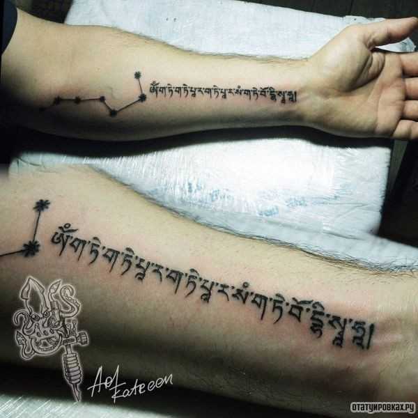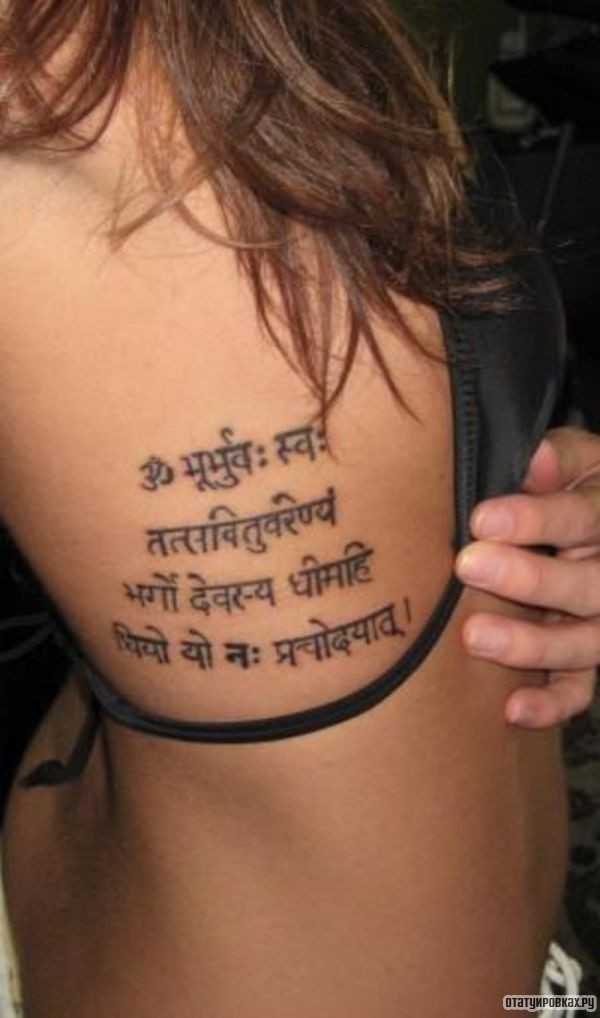 Мантрой называется, сочетание букв на санскрите. Правильное написание и произношение каждой буквы, очень важно, потому как значение мантры может меняться. Стоит очень ответственно подходить к повторению и ношению мантр на теле, так как их влияние на судьбу человека огромно. В основном мантры набивают мелким шрифтом, на лопатки, пальцы, предплечья, шею.
